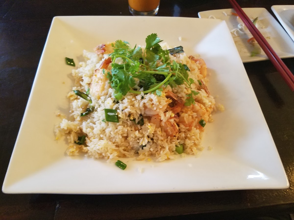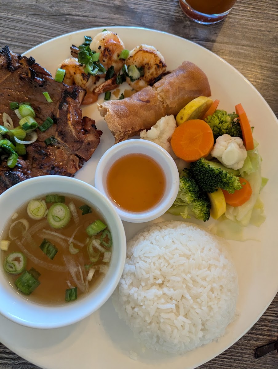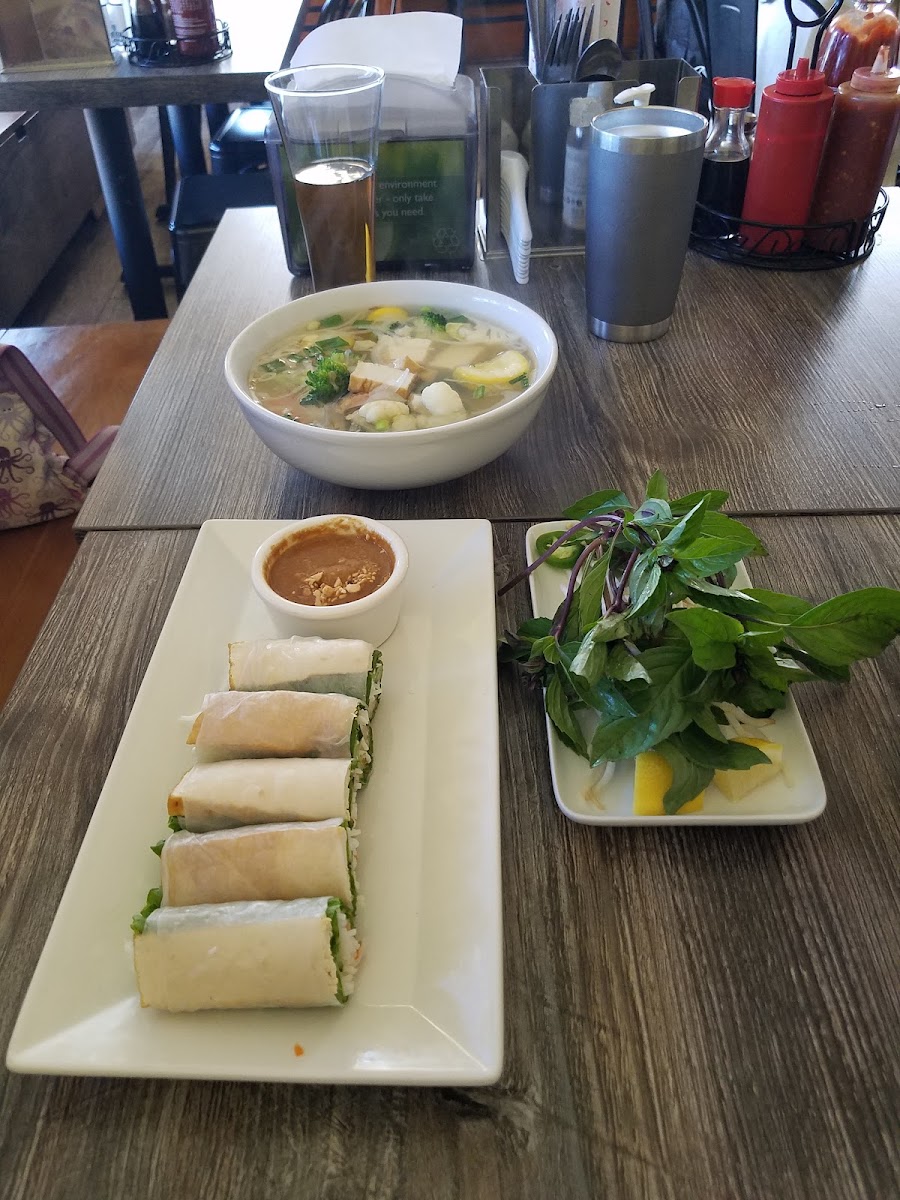 Staff was friendly. Got the pho dish. Alot of noodles. My husband got the dry noodle dish with shrimp and imperial rolls which was so good. We also got the tofu spring roll which I think we'll skip next time. Would definitely go back. Not a bad option for the area. Paid parking in the back.