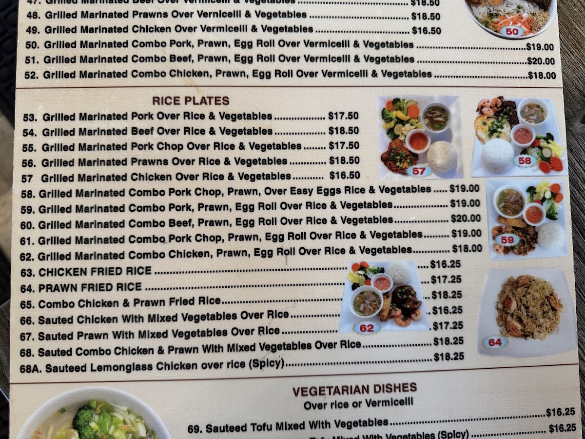 Guests can enjoy hearty options like the Special Combination Pho or the Beef Stew with noodles, which provide a soothing, generous meal experience. For lighter fare or midday bites, selections such as the Grilled Marinated Beef over Vermicelli and Vegetables or the Organic Veggie Tofu Sandwich fit naturally into the relaxed atmosphere. The menu also includes a range of appetizers like crispy egg rolls and fried prawns, ideal for sharing or starting off your meal.